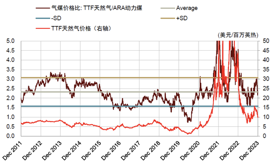 图表35:欧洲气煤价格比值回归正常区间,不过天然气价格仍处于相对高位