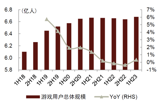 图表16:2019年后国内游戏用户规模增幅持续缩减,自2022年起用户规模总量趋于稳定,1H23小幅回升