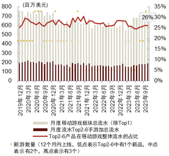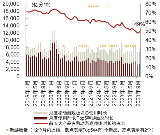 注:月度使用时长Top5手游指当月的月使用时长前五大的手游,此处统计口径为iOS及Android渠道,系第三方统计,仅做参考。为与右图进行比较,我们同时用“月使用时长Top2-6”进行计算,趋势与上述情况一致。部分中长尾产品或未纳入第三方统计,故实际数据或与上图统计略有差异