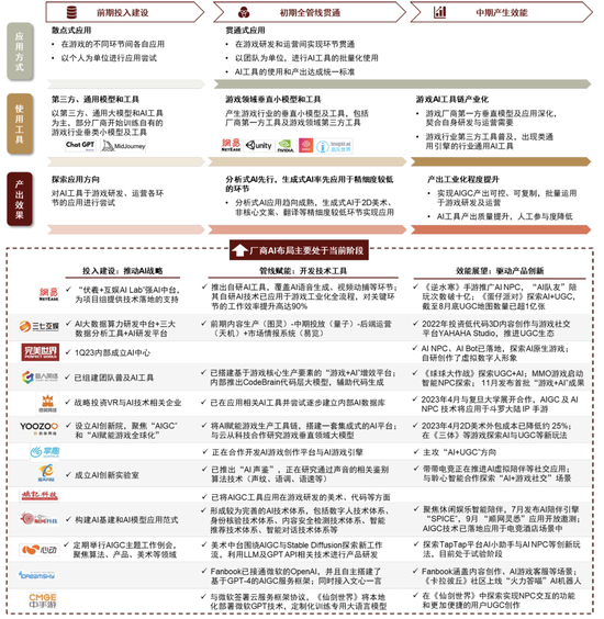 图表17:游戏厂商AI布局主要处于从投入建设到全管线贯通的探索阶段,多厂商已推出AI工具并应用于产品