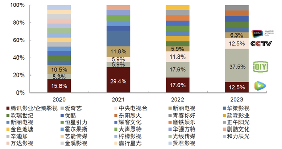 注:按2020~2023年Top10热播上新连续剧出品公司数量统计,若剧集有多个出品方,统计前两名出品方;2023年数据为2023年前三季度
