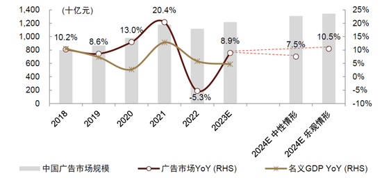 注:广告市场规模2023~2024E及2023E名义GDP增速均为中金预测