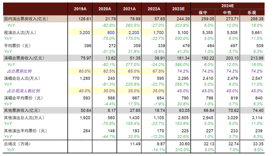 线下演出消费繁荣,2023年市场规模强劲复苏。线下演出量价齐升,演出票务平台竞争格局相对稳定。随着积压观影需求的释放及大型演出的举办数量的供给增多,线下演出平均票价呈现提升趋势。我们认为,随着头部艺人巡演计划持续和演出供给的丰富多元化,观演热情将持续提升,带动演出市场规模增长。我们预计在保守/中性/乐观情况下2024年演出票房分别为259/274/288亿元。