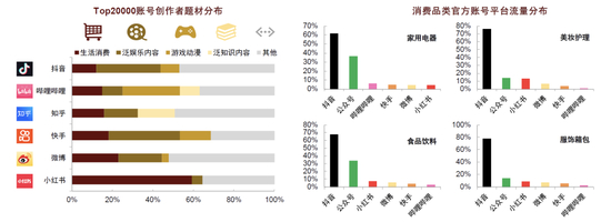 注:Top20000创作者分布中,泛娱乐内容包括影视娱乐、音乐、幽默搞笑、颜值等,泛知识内容主要包括教育、知识、科普等;消费品官方账号流量分布指平台去重活跃用户/该品类全网官方账号去重活跃用户数