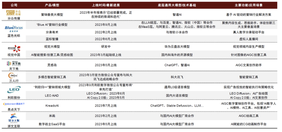 AI驱动广告行业生产力变革,多业态赋能营销厂商。从产业链视角来看,我们认为AI有望对营销广告全环节带来积极影响,包括在广告主层面降低营销投放门槛、在营销服务商层面提升创意素材生产的效率与质量、在渠道层面提升投放效率与转化效果等。从AI赋能业务的模式来看,我们认为主要围绕:1)内部提质、提效,加强对核心广告主的服务能力;2)构建标准化的AI工具,扩大中长尾广告主覆盖面;3)发展C端能力;4)以AI能力拓展新业务模式,包括数字人、虚拟直播间、数字藏品等。我们建议持续关注AI技术对营销广告行业模式及生态的影响。