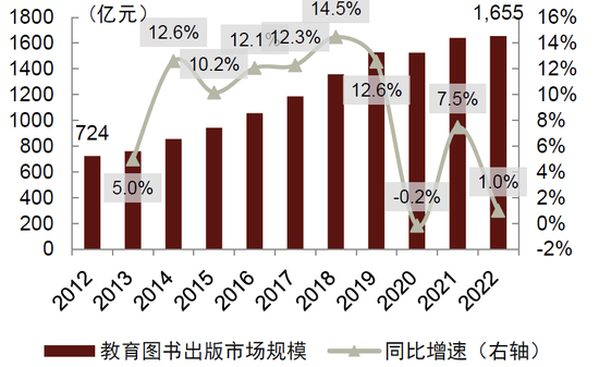 注:教育图书出版市场规模计算方法为:全国教材教辅市场规模与全国零售市场码洋规模之和减去全国教辅教材零售市场码洋规模;2022年市场规模为我们预计,以2022年图书出版上市公司教辅教材的总收入的同比增速(10%)测算2022年全国教辅教材市场规模同比增速