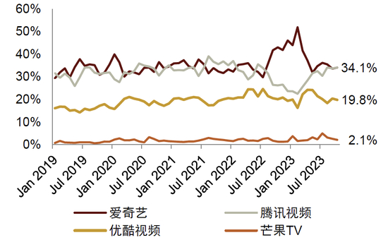 图表5:长视频平台综艺市占率:2019年以来四家平台竞争相对胶着