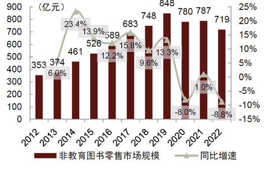 图表29:2012~2022年非教育图书零售市场规模:2022年为719亿元,同比下降8.8%