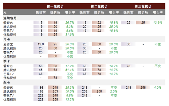 图表7:长视频平台涨价路径回顾,已经历2~3轮提价