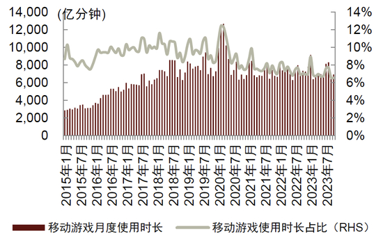 图表15:移动游戏时长在互联网总体使用时长的占比在2020年达到高点,当前在6~8%区间波动