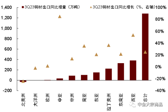 支撑钢材产需超预期的最大助力依然在外部,我们预计今年钢材出口可能达到9000万吨,同比增速在34%。国内钢价趋弱与人民币贬值等因素提升了钢材出口性价比。另一方面,东南亚、中东等地区基建与制造业固投的增长带动了偏上游加工品的需求,可能面临阶段性的钢材产能缺口。因此今年美欧等经济体大幅加息的同时,往中东、拉美、东南亚等带路地区反而贡献了钢材出口的主要增量。