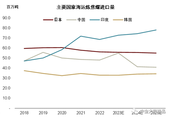 需求侧,印度生铁产量增加或将进一步提升其进口需求。自2021年起,印度已超越日本成为全球最大的海运炼焦煤进口国,对海运炼焦煤市场定价有较大的影响力。印度炼焦煤资源较为贫乏,对澳大利亚等地的优质海运主焦煤的进口依赖度较高,2022 年进口依赖度约92%,其中澳煤占比约55%。日韩、欧洲等地高炉复产亦将提升海运炼焦煤的进口需求,分流海运煤资源。因此,我们预计明年海运煤进口可能面临印度、东南亚、欧洲等地的竞争。我们预计明年海运煤价格中枢(澳洲PLV HCC)可能在250美元/吨以上。
