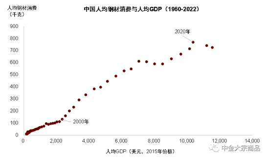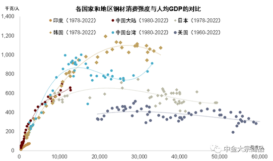图表:各国家和地区钢材消费强度与人均GDP的对比