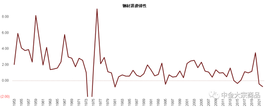 需求达峰的一个表现是钢材消费相对于经济增长的弹性或将降低。2000-2022年期间钢材消费弹性系数(钢材消费量增速/GDP增速)的平均值为1.08,说明在经济增长的同时,国内钢材消费基本“亦步亦趋”。但国际经验表明,钢材消费并非没有上限,在跨过峰值后,我们预计钢材消费弹性或将趋于回落。自下而上看,地产对钢材需求增长已基本进入负贡献区域。基建逆周期调节的性质也决定了其持续性或比较有限。制造业需求点较为分散,难以形成集中带动,增量难以完全对冲减量。(《铁元素的需求穹顶》)