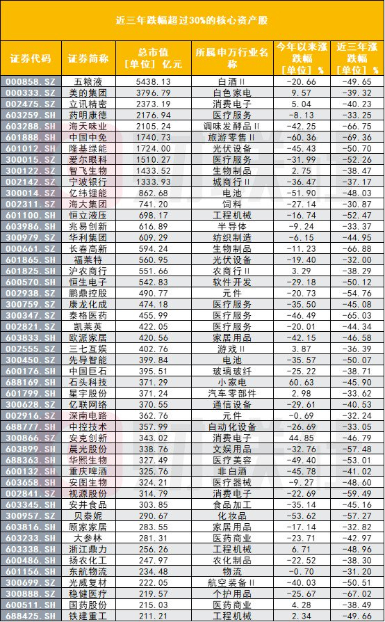 哪些核心资产已处于超跌名列?记者梳理发现,上述133家上市公司共有49只个股近3年跌幅超30%。(如下图)