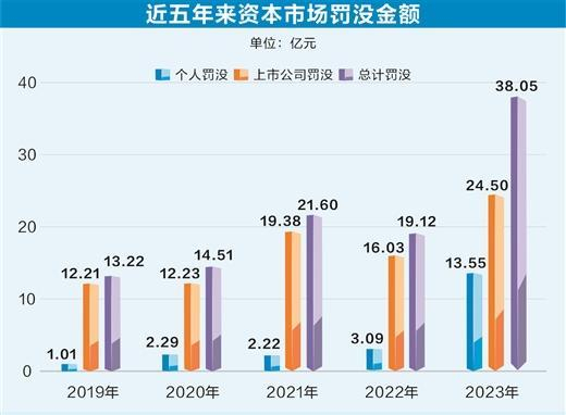 从处罚金额看,2023年A股公司及个人违规罚没金额合计38.05亿元,创近五年新高,比2022年的19.12亿元近乎翻倍。其中,对上市公司的罚没金额创下新高,为24.5亿元;对相关个人的罚没金额更是大幅增加3.39倍,一举超过10亿元大关,为13.55亿元。