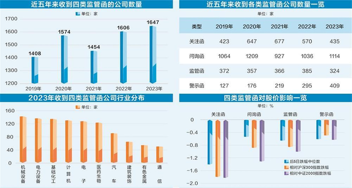 证券时报·数据宝统计,2023年共计有1647家公司收到交易所上述函件,这一数量创下近五年来新高。和往年类似,2023年“受到关注”的公司包括部分千亿元市值的大企业,体现出监管规则面前大小企业平等的原则。