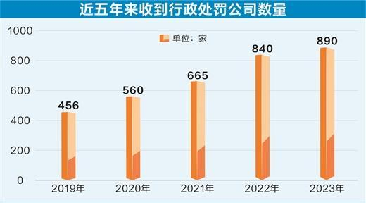 证券时报·数据宝统计,2023年共计有890家A股公司披露了由各级监管机构出具的行政处罚文件,共计1551份,两项数据均创出近五年来新高。