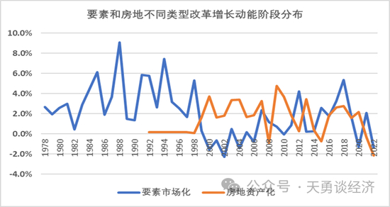 周天勇:是不一样。如图1所示,一是每一类体制改革推动经济增长不可能永续,其呈边际递减的趋势;二是中国经济体制,先是进行要素利益导向刺激和优化流动配置的市场化改革,再是推进了城镇住宅货币化分配和土地有偿出让的房地资产化改革。因此,两段时间中,国民经济增长通过体制改革获得动能的轻重主次也不一样。