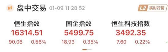 港股方面,1月9日早盘,港股反弹,恒生指数一度涨超1%。截至发稿,恒生指数涨0.56%,报16314.51点;恒生国企指数涨0.35%,报5499.75点;恒生科技指数涨0.22%,报3492.35点。盘面上,药品及生物科技、电讯板块领涨,保险、公用事业、地产活跃,汽车板块领跌。