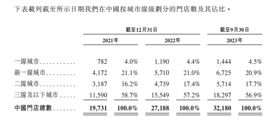 从城市布局看,蜜雪冰城在一线城市门店网络占比4.5%,新一线城市占比20.9%,二线城市占比17.7%,三线城市及以下城市占比56.9%。