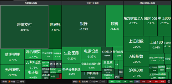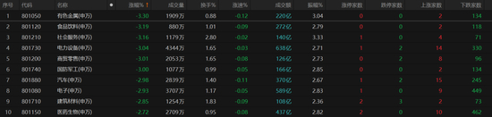 其中,有色金属、食品饮料、社会服务、电力设备、商贸零售、国防军工等板块跌幅居前,均跌超3%。汽车、电子、建筑材料、医药生物等板块跟跌。