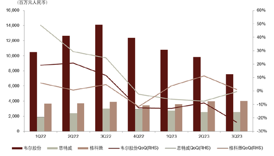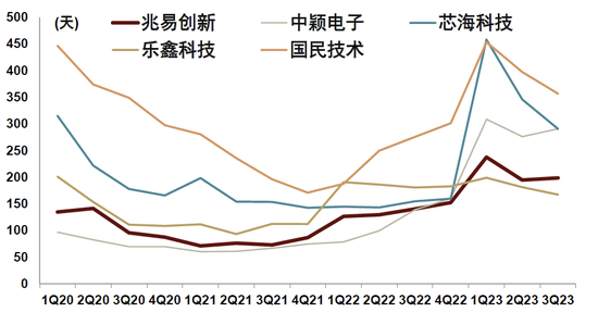 季度收入方面,截至3Q23,大部分公司呈现环比上升趋势,我们认为随着代工成本下降效果逐步显现,以及行业价格有望修复,行业盈利能力有望同步上升(其中格科微的盈利下滑主要由于工厂新增折旧)。我们看到韦尔股份存货价值在2022年快速上升,4Q22开始大幅下降,目前已经恢复到相对合理水平。格科微存货相对稳定,主要是由于新产品的准备库存以及逆周期的备货策略。思特威存货在3Q22达到高点,随后逐个季度下降,我们预计2023年年底回归至健康水平。