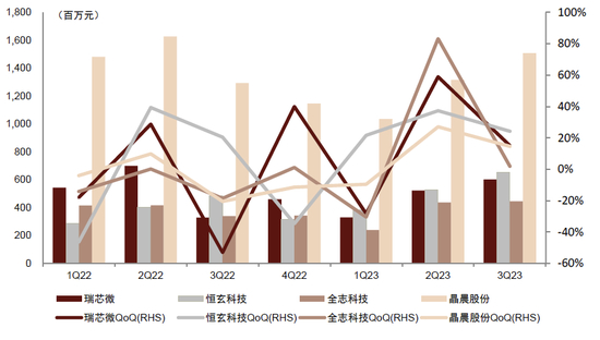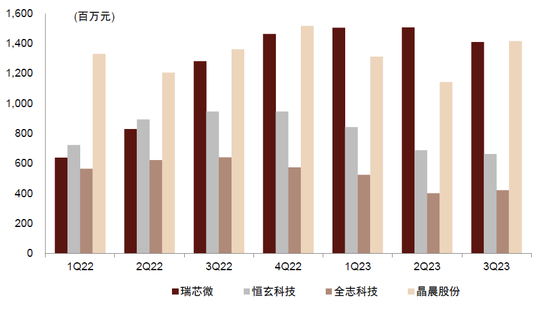 我们认为,1H23半导体行业处于去库存阶段,2H23景气度总体上触底回升,其中的结构性分化依然存在,消费电子温和复苏,汽车电子及AI相关应用的需求维持强劲,而工业及光伏类存在去库压力。我们看到2022年10月半导体二级市场开始筑底,半导体指数(申万行业分类)开始震荡上升;2023年初AI产业链相关标的带动半导体板块大幅跑赢大盘,半导体指数自3月16日至4月7日最高点累计上涨14%;4月中下旬起半导体板块整体出现大幅回调,我们认为主因部分公司1Q23、2Q23业绩低于复苏市场预期,同时前期市场情绪较高的AI概念标的明显回调;10月下旬各厂商发布三季报,受益于消费电子需求复苏及客户补库,芯片设计板块3Q23业绩同比转增,表明半导体行业有望实现周期反转,半导体指数10月23日至12月22日在大盘下跌的背景下累计上涨4%。
