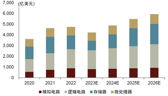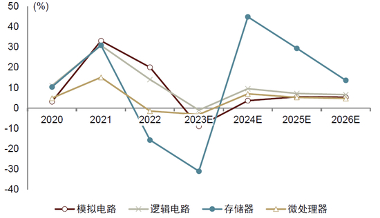 具体看集成电路细分领域,未来三年存储器市场有望实现高速增长。WSTS预计2024年模拟电路/逻辑电路/存储器/微处理器的市场规模分别达到841/1,917/1,298/819亿美元,预计到2026年市场规模分别达到935/2,191/1,908/903亿美元;其中,存储器市场增速最快,2023-2026年CAGR达28.7%。