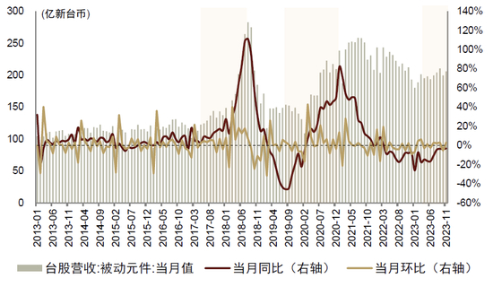 回顾2023年:我们认为行业整体上已走出下行周期,但细分品类厂商之间呈现分化。2023年1月至今,台股被动元件月度营收同比降幅呈收窄趋势,11月已收窄至-3%,环比增速在0%左右波动,从过往10年的被动元器件周期来看,我们认为当前行业已走出下行周期。分产品品类看,MLCC、片式电感、电阻等(以下简称“小尺寸”)主要用于智能手机、PC、基站、服务器、车载信息娱乐等应用场景,受益于智能手机、PC下游客户补库存需求以及2H22低基数,相关厂商1Q23~3Q23季度营收同比增速逐季升高,3Q23单季度基本实现30%以上同比增长,同时产能利用率回升使得盈利能力有所修复。薄膜电容、铝电解电容、大型插装电感等(以下简称“大尺寸”)主要用于工业、光伏储能、新能源车等应用场景,终端需求维持较高景气度,但进入3Q23以来,下游逆变器行业库存高企导致大尺寸厂商出货不利,部分厂商3Q23单季度营收同比下滑。