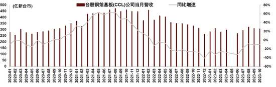 图表:台股铜箔基板(CCL)公司当月营收及同比增速(亿新台币)