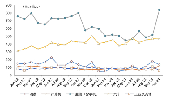 图表:国内模拟芯片单月销售额(按下游应用拆分)