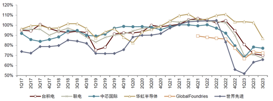 图表:1Q17-3Q23全球主要晶圆代工企业稼动率