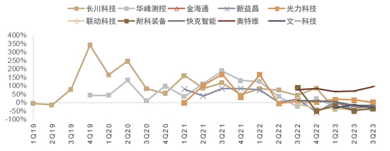 回顾2023年:封测设备和材料板块主要受到封测产能利用率的影响,过去几季度整体收入规模和合同负债有明显的下滑。其中收入同比仍有明显下滑幅度,但合同负债金额已基本企稳。我们认为随着封测厂产能利用率的逐步提升,以及新的下游芯片产品的研发和技术的突破,国产设备厂商的订单有望实现逐步恢复。