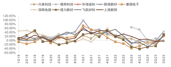 回顾2023年:3Q23原材料价格有所回升,目前CCL底部震荡后有望逐步复苏。环氧树脂价格9月市场平均价环比8月增长约2.1%,台股玻璃纱、布公司3Q23营收环比增长8.6%,台股CCL公司3Q23营收环比增长9.14%,反映行业需求有所复苏。我们认为,目前CCL价格已经筑底,明年复苏力度取决于下游PCB需求复苏节奏和终端电子产品需求情况。
