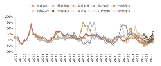 封测代工板块1Q23形成了中期行业景气度底部,2Q23、3Q23整体呈现出产能利用率、毛利率恢复态势,但仍然受到芯片设计客户库存结构分化影响。由于2023年中消费电子终端新产品如手机、PC、可穿戴以及其他AIoT产品的发布,叠加3Q23品牌厂商围绕“双十一”竞争加剧,部分手机芯片出现了加急订单情况,带动了库存的快速出清和补库需求。但工业以及其他领域的景气度基本维持缓慢恢复的状态。考虑到目前手机、PC终端的芯片库存总额,我们认为传统封测代工(剔除Chiplet先进封装)的行业景气度将在1Q24进入正常季节性波动。