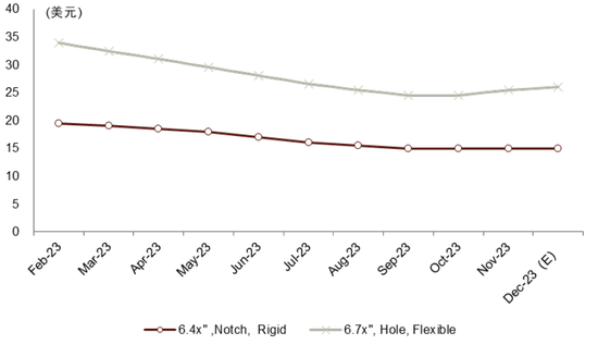 LCD面板方面,回顾2023年,LCD TV面板价格先涨后跌,我们认为1-3Q的价格上涨主要受益于行业备货需求、面板厂动态控制稼动率在合理水平,随着年中左右面板价格突破现金成本线,面板厂商的盈利情况有所改善。我们认为近一个季度以来的价格下跌则主要由于三季度稼动率短暂冲高后的供给过剩,以及下游需求未见明显反弹。展望2024年,我们维持此前观点,我们认为面板厂将持续控制LCD稼动率以维持盈利,LCD TV面板价格继续向下的空间较小。我们建议关注1Q24末的行业供需改善情况(对应下游3Q24的旺季拉货需求),我们看好2024年LCD TV面板行业供需趋于健康,稼动率有望继续修复,面板平均价格上涨。