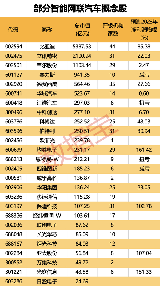证券时报·数据宝统计,A股市场的智能网联汽车概念股中,千亿市值个股共计3只,分别是比亚迪5387.53亿元、立讯精密2100.94亿元、韦尔股份1103.44亿元。