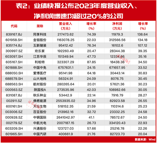 从成长性角度统计,有色金属股同享科技、金钼股份、专用设备制造类公司五新隧装的净利润同比增速则更为“抢眼”,相较2022年度,均实现了翻倍增长。且统计显示,目前发布业绩快报的公司中,有94家公司全年盈利且同比增长,若进一步结合营业收入情况统计,则共有76家公司营业收入和归母净利润双双增长,同享科技、金钼股份、五新隧装、欢乐家等19家公司更是两项主要财务数据增速均超过了20%(见表2)。