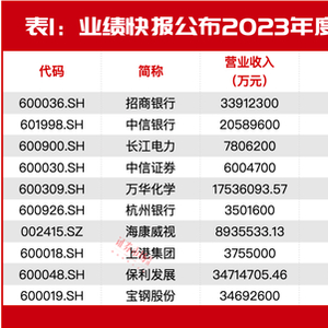 目前,共有132家公司提前于正式年报发布了业绩快报,从盈利额来看,招商银行的“赚钱”能力最强,2023年实现归母净利润1466.02亿元,相较2022年增长6.22%。另外,中信银行、长江电力、中信证券等9家公司的年度归母净利润也均超过了百亿元(见表1)。