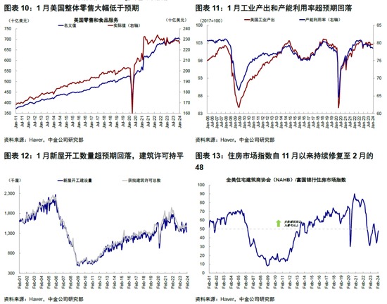 与通胀超预期形成鲜明对比的是,同期公布的1月美国主要经济数据如零售、工业产出以及新屋开工数据均低于预期,这背后可能与12月假期消费的高基数,以及1月相对寒冷天气抑制了部分经济活动有关。偏弱的经济数据部分对冲了超预期通胀对利率和降息放缓的压力,也是美股跌幅有限的原因之一。具体看,