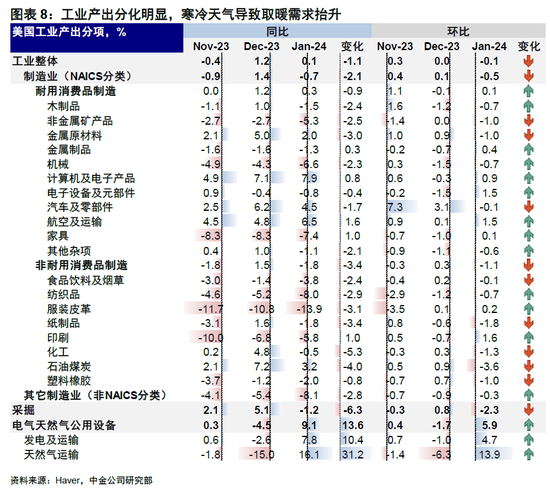 ►工业产出分化明显,寒冷天气导致取暖需求抬升。制造和采掘产出受天气影响分别环比超预期回落0.5%和2.3%,然而寒冷天气导致取暖需求抬升,公用事业产出环比近6%,其中发电及运输抬升4.7%,天然气运输抬升13.9%。