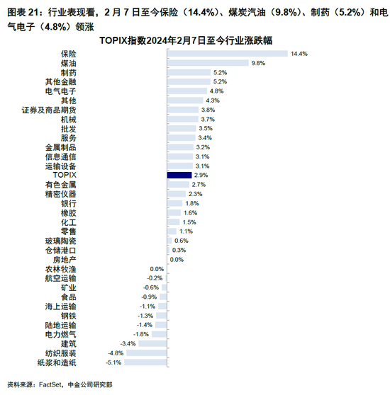 春节假期日经225指数春节期间突破38000点,距泡沫期间38957点位只有约1%的差距。从2月7日快速上涨开始,日经225指数上涨6.6%(以美元计价涨幅4.9%),估值抬升5.1%为主要贡献。行业表现看,2月7日至今保险(14.4%)、煤炭汽油(9.8%)、制药(5.2%)和电气电子(4.8%)领涨。作为对比,日本GDP连续两个季度负增长,陷入“技术性”衰退。日本四季度实际GDP年化季环比下滑0.4%(三季度下滑3.3%)。分项看,占比最大的个人消费以及固定资产投资均连续三个季度负增长。