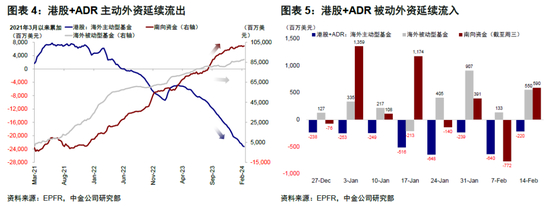 资金面上,中国市场主动外资流出收窄。EPFR跟踪的数据显示,上周截止2月14日,海外主动资金继续流出港股和ADR,但流出的规模显著收窄。全球范围看,美股、发达欧洲、日本和新兴市场主动外资延续流出,印度(印度Nifty指数+1.3%)成为主动外资唯一流入的市场。