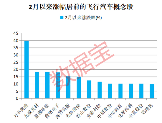 2月以来,飞行汽车概念股整体大幅反弹。证券时报·数据宝统计,截至3月4日收盘,概念股2月以来平均涨幅10.2%。万丰奥威累计涨幅39.62%排在第一位,其次是光威复材、星源卓镁、商络电子、海特高新、光洋股份等。