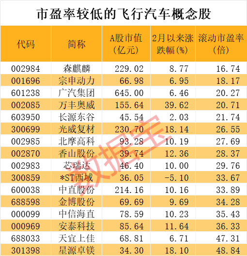 截至3月4日收盘,飞行汽车概念股中,森麒麟、宗申动力、广汽集团、万丰奥威、长源东谷等9股滚动市盈率低于30倍。