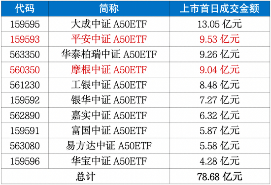 而从上市首日成交金额来看,平安中证A50ETF(159593)、摩根中证A50ETF(560350)上市首日成交金额分别为9.53亿元、9.04亿元,首批10只中证A50ETF基金上市首日成交总金额近80亿元。