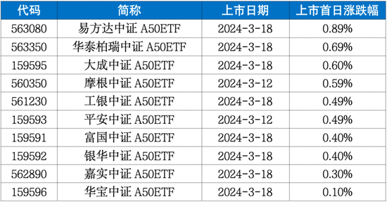 表1:首批10只中证A50ETF产品上市首日涨幅