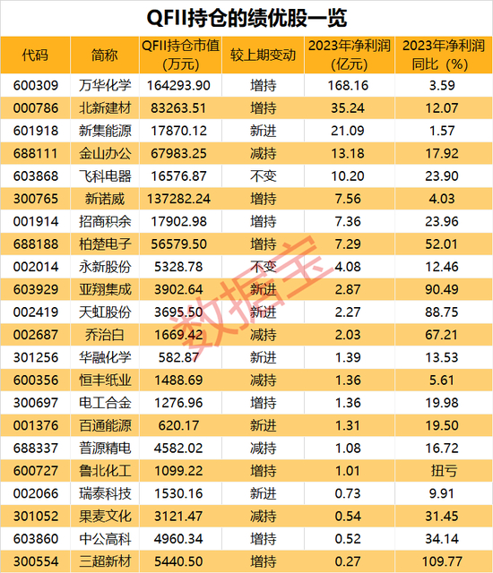 2023年年末,QFII持仓市值超亿元的个股有12只。其中,QFII持仓市值最高的是万华化学,期末持仓市值达到16.43亿元。值得关注的是,私募大佬邓晓峰管理的高毅晓峰2号致信基金在去年四季度新进万华化学前十大流通股东名单,买进2014.16万股,期末持仓市值达到15.47亿元。