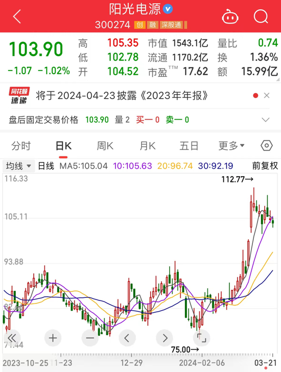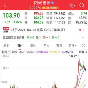 阳光电源今日下跌1.02%,收盘价为103.9元/股;2月以来,该股股价累计上涨32.54%。